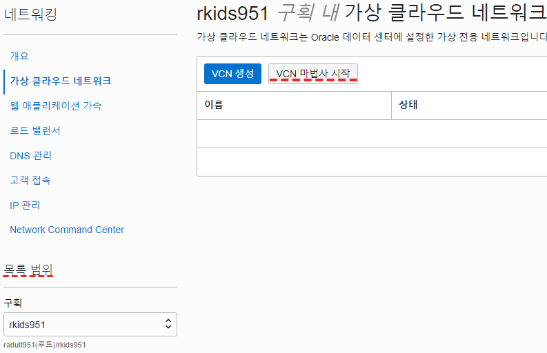 방금 새로 만든 구획을 선택후 VCN 마법사 시작을 누른다.