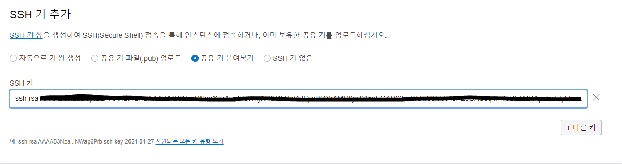 그리고 ssh 키를 추가하는 부분이 있는데, 웬만하면 공용 키 붙여넣기를 선택하는 것이 좋다.