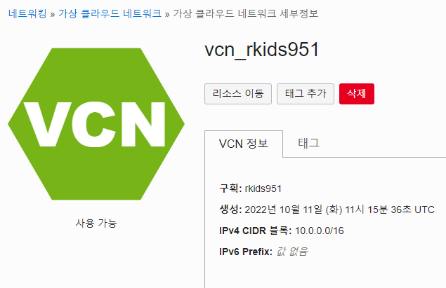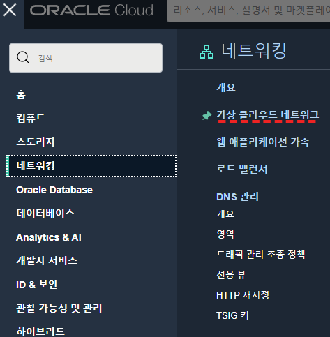 메뉴 - 네트워킹 - 가상 클라우드 네트워크