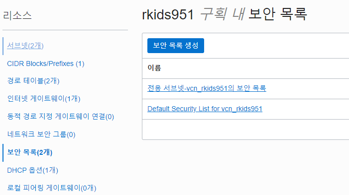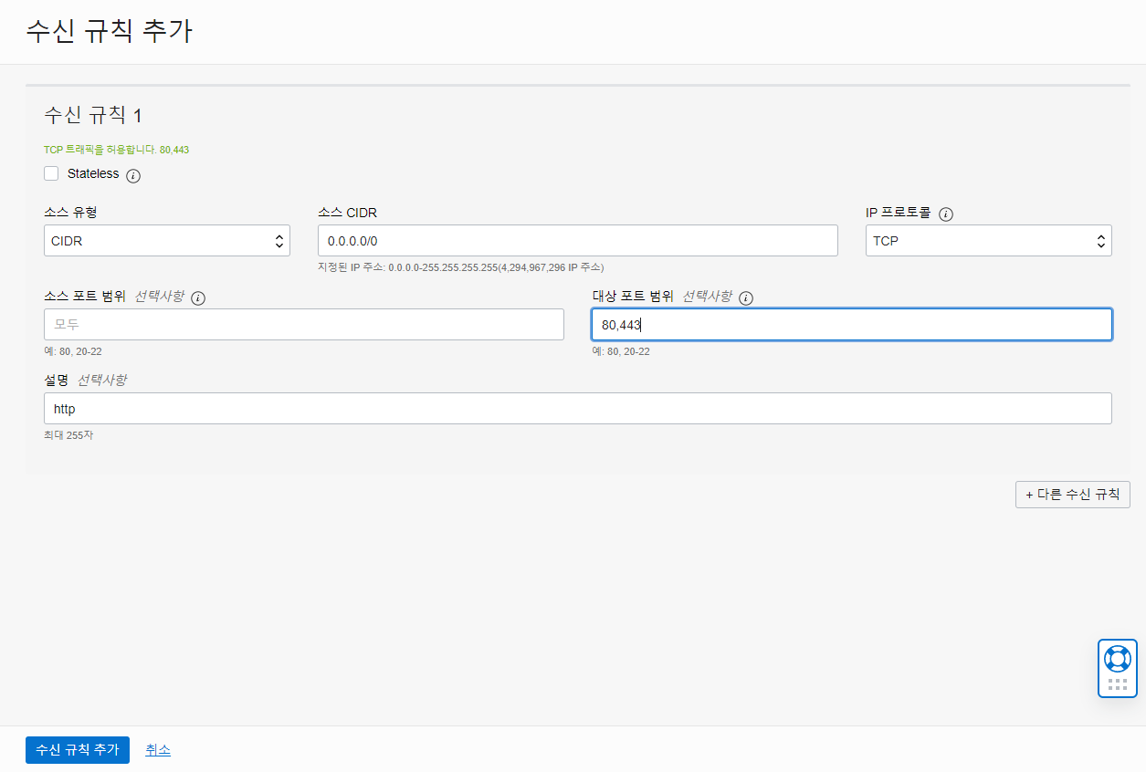 리소스 - 보안 목록 - Default Security List for [vcn 이름] - 수신 규칙 추가