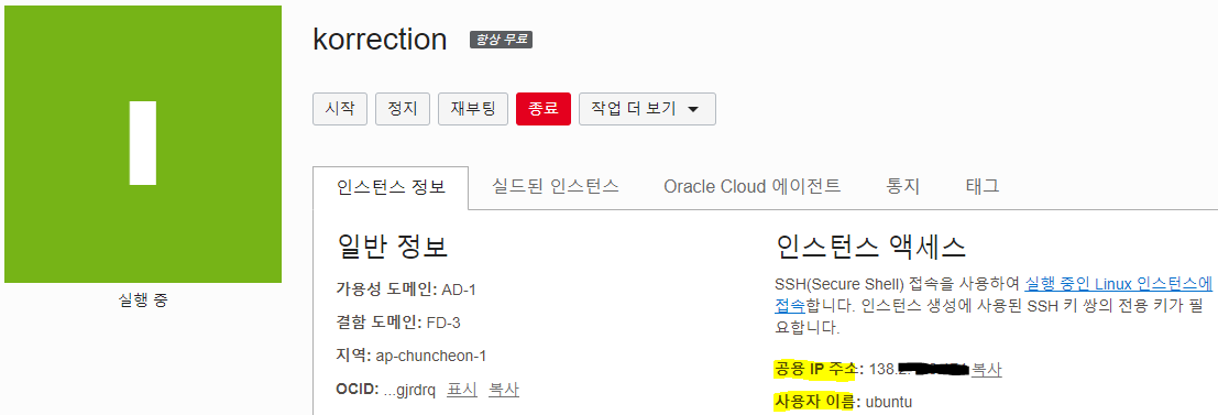인스턴스 액세스 정보에 공용 IP 주소와 사용자 이름이 나와있다.