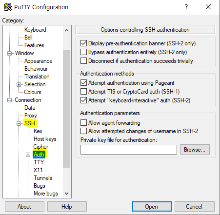 SSH - Auth - Private key file authentication - Browse - key 파일 선택 - Open