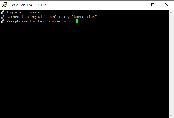 ubuntu를 입력해주고, key 파일을 만들 때 썼던 비밀번호를 입력해준다. (이 때 비밀번호가 입력되는 부분은 안보이는 것이 맞다. 그냥 안보이는 상태에서 계속 입력해준 후 엔터를 누르면 된다.)