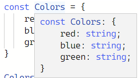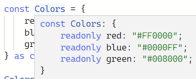 Colors 변수 내부에 추론된 값을 보면 각 속성이 원시 타입으로 추론된다. 이는 const로 객체를 선언했지만, 객체 내부의 값들은 언제든지 바꿀 수 있기 때문이다.