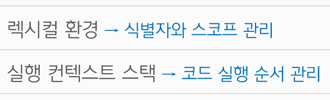 식별자와 스코프는 실행 컨텍스트의 렉시컬 환경으로 관리하고, 코드 실행 순서는 실행 컨텍스트 스택으로 관리한다.