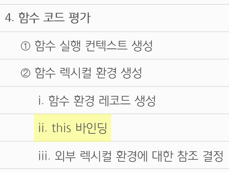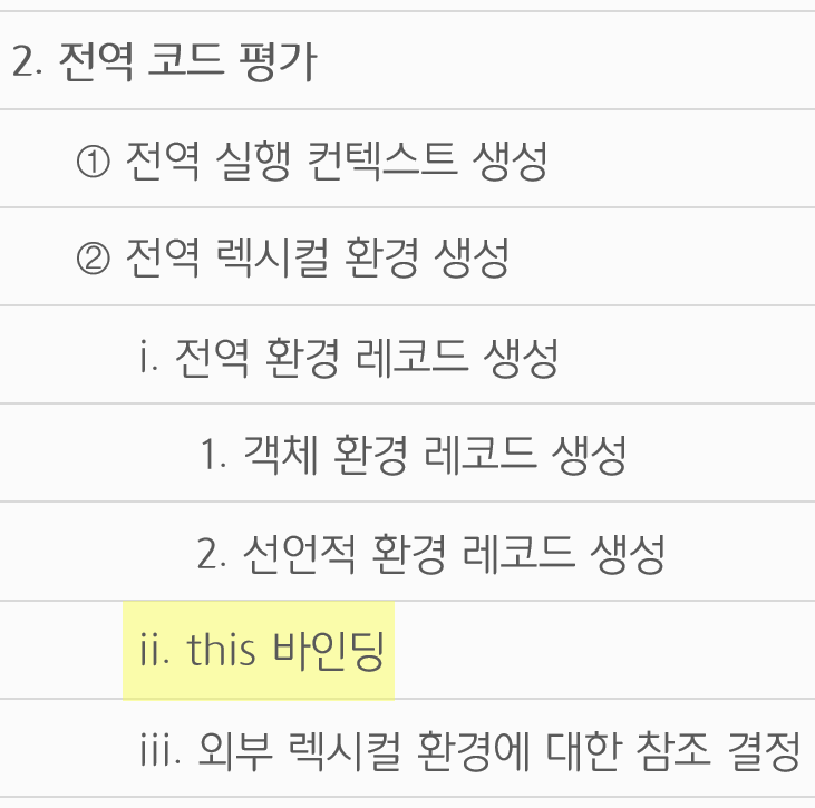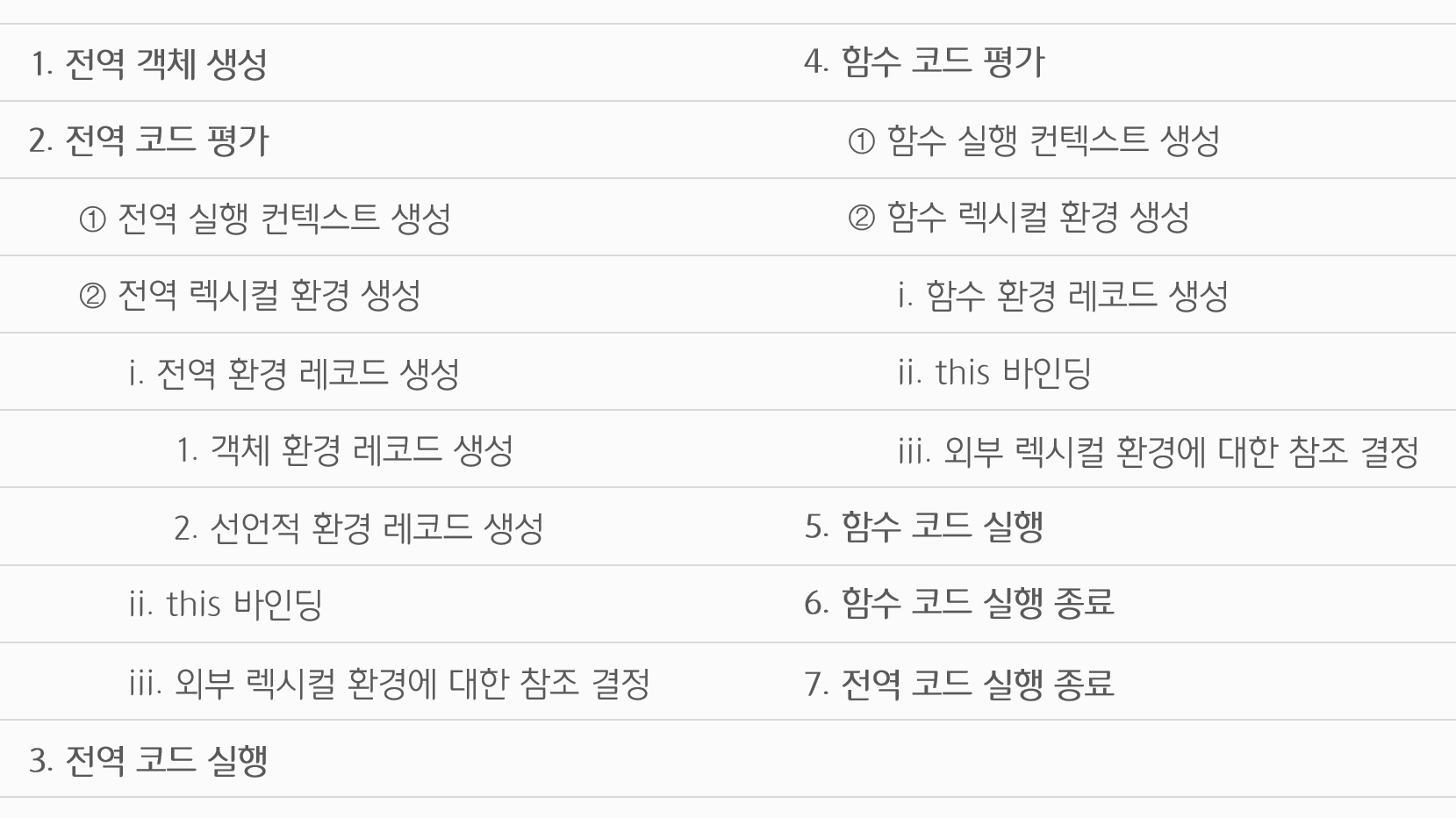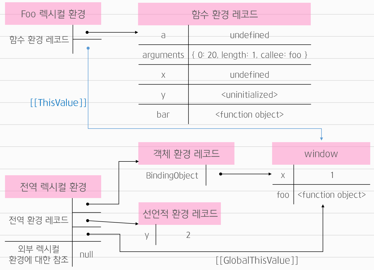 참고로 객체 환경 레코드와 선언적 환경 레코드에는 this 바인딩이 없다. this 바인딩은 전역 환경 레코드와 함수 환경 레코드에만 존재한다.