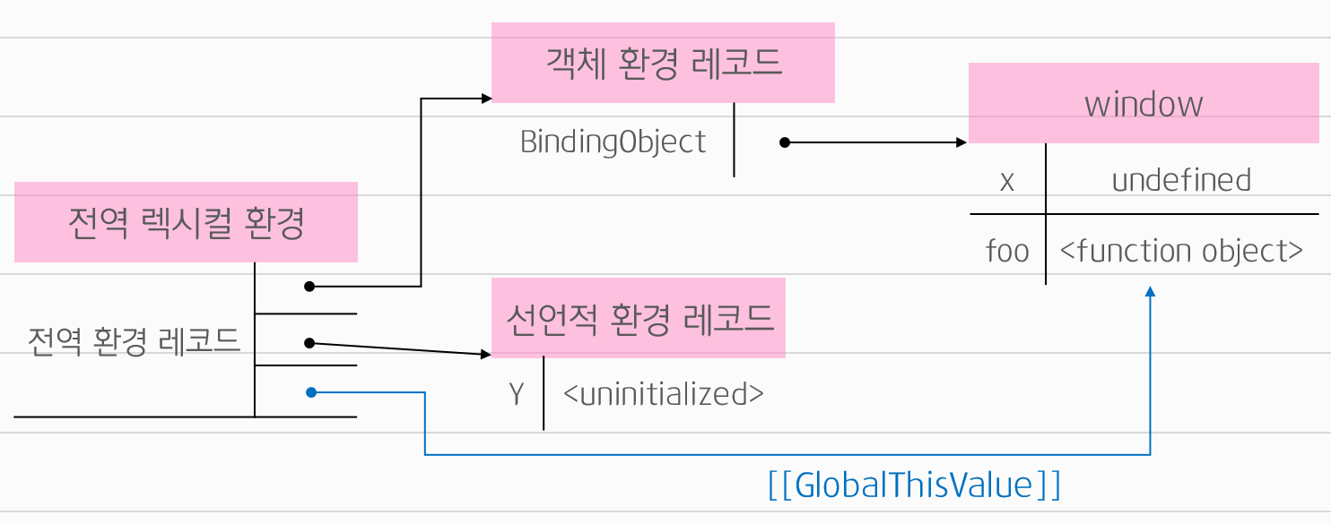 var로 선언한 전역 변수, 함수 선언문으로 정의된 전역 함수는 객체 환경 레코드에 연결된 BindingObject를 통해 전역 객체의 프로퍼티와 메서드가 된다.