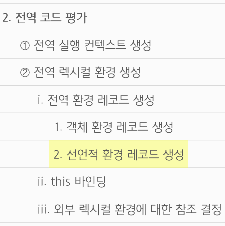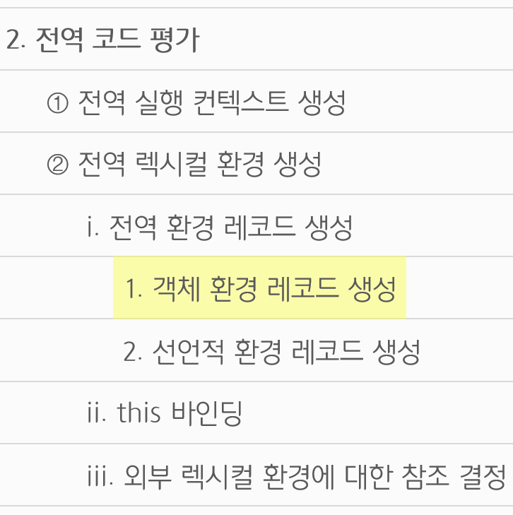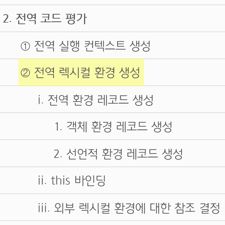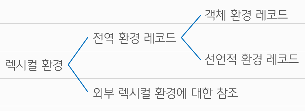 렉시컬 환경은 환경 레코드(Environment Record)와 외부 렉시컬 환경에 대한 참조(OuterLexicalEnvironmentReference)로 구성된다.