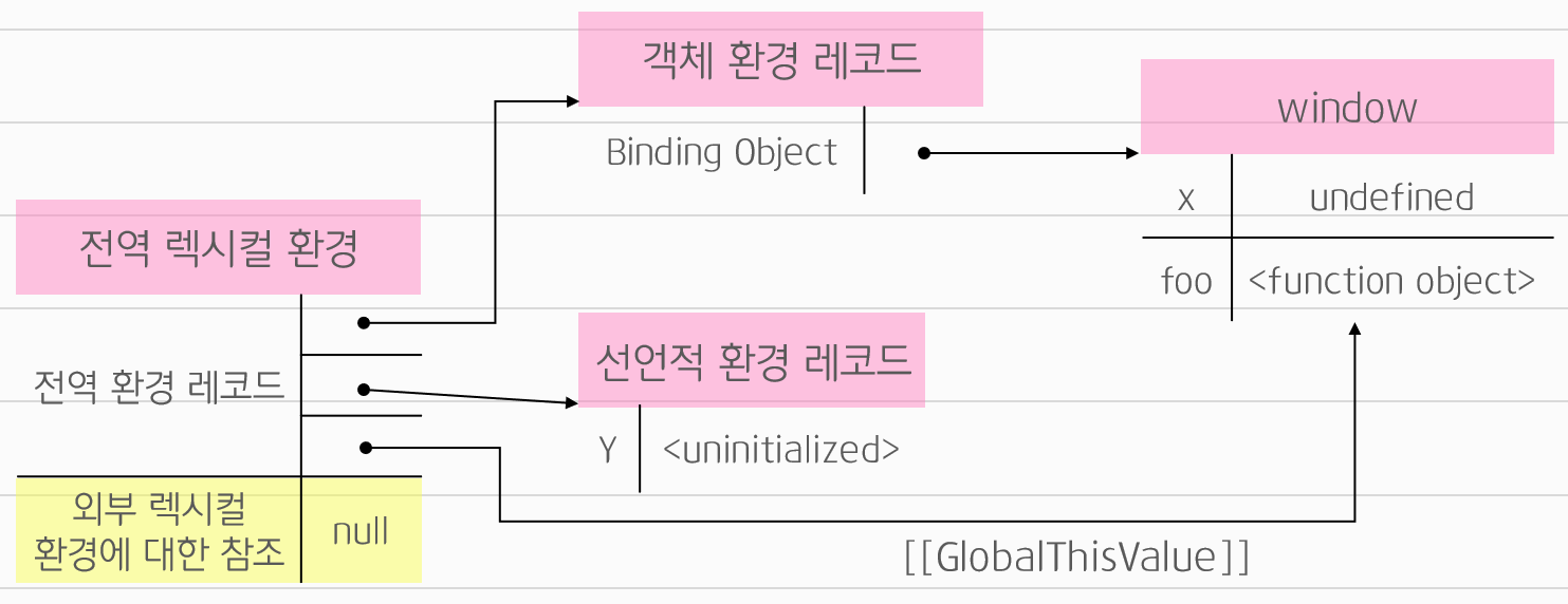 foo 함수는 전역 코드에 정의된 전역 함수이다. 따라서 foo 함수 정의는 전역 코드 평가 시점에 평가되고, 이 시점의 실행 중인 실행 컨텍스트는 전역 실행 컨텍스트이다. 따라서 외부 렉시컬 환경에 대한 참조에는 전역 렉시컬 환경의 참조가 할당된다.