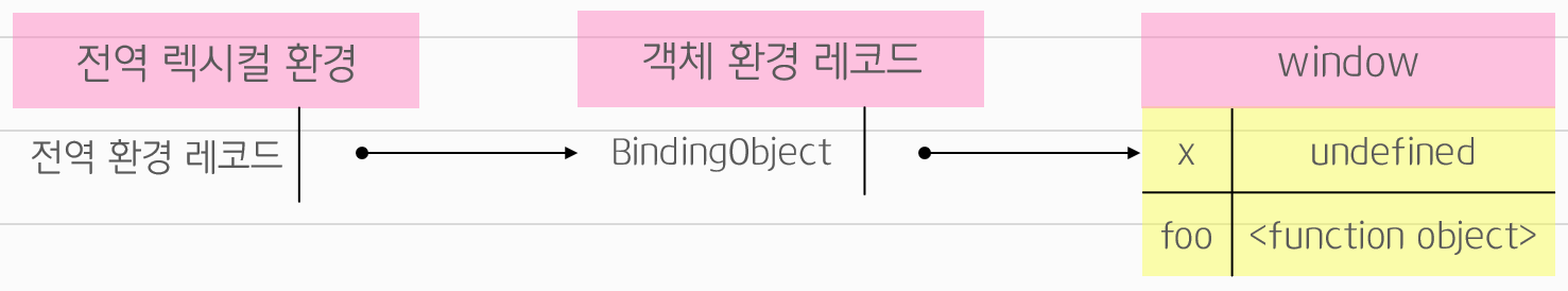 이때 등록된 식별자를 객체 환경 레코드에서 검색하면 전역 객체의 프로퍼티를 검색하여 반환한다. 이것이 전역 객체를 가리키는 식별자(window) 없이 전역 객체의 프로퍼티를 참조(e.g. window.alert을 alert으로 참조)할 수 있는 메커니즘이다.
