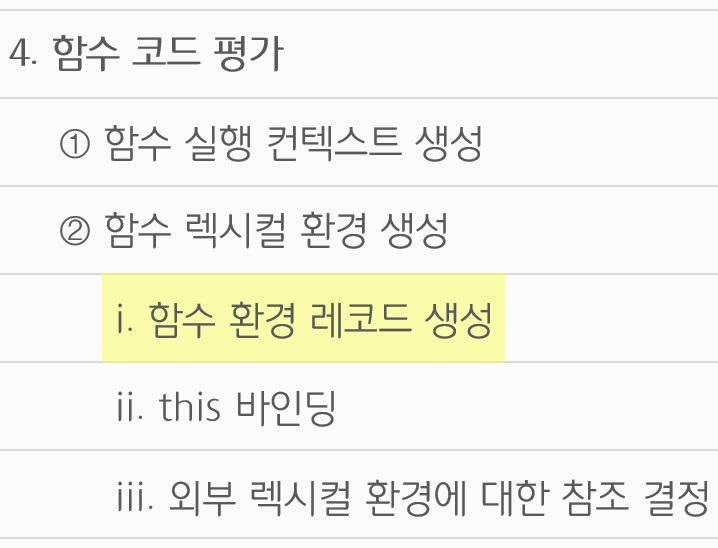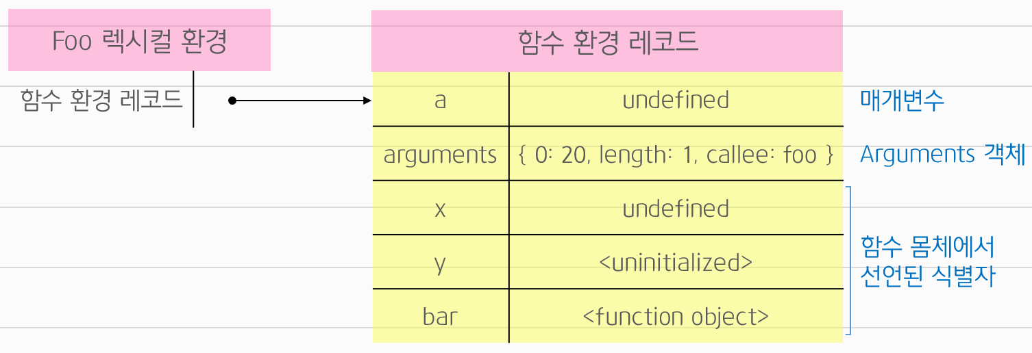 함수 환경 레코드는 매개변수, arguments 객체, 함수 내부에서 선언한 지역 변수와 중첩 함수를 등록하고 관리한다.