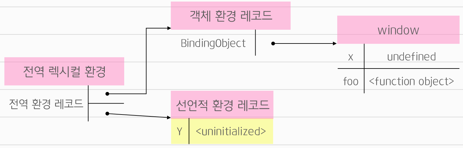 이처럼 var로 선언한 전역 변수와 let, const로 선언한 전역 변수를 구분해 관리하기 위해 전역 스코프 역할을 하는 전역 환경 레코드는 객체 환경 레코드와 선언적 환경 레코드로 구성되어 있다.