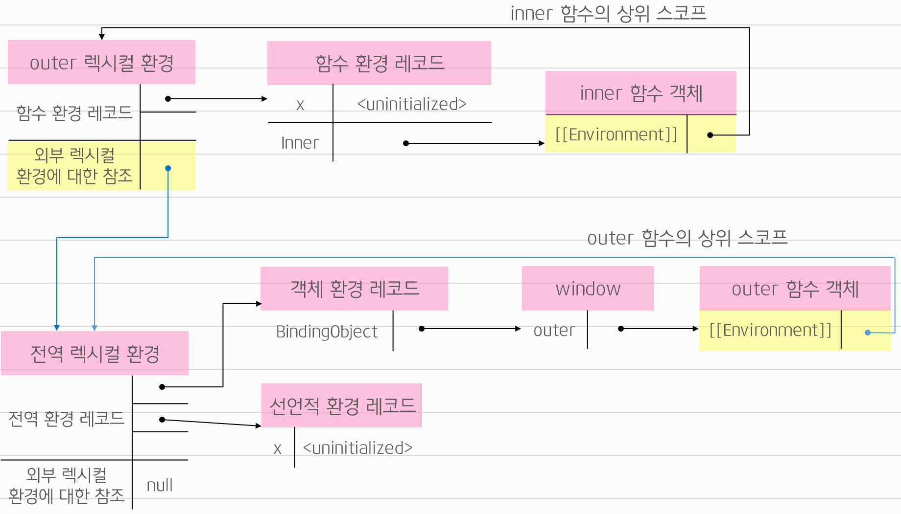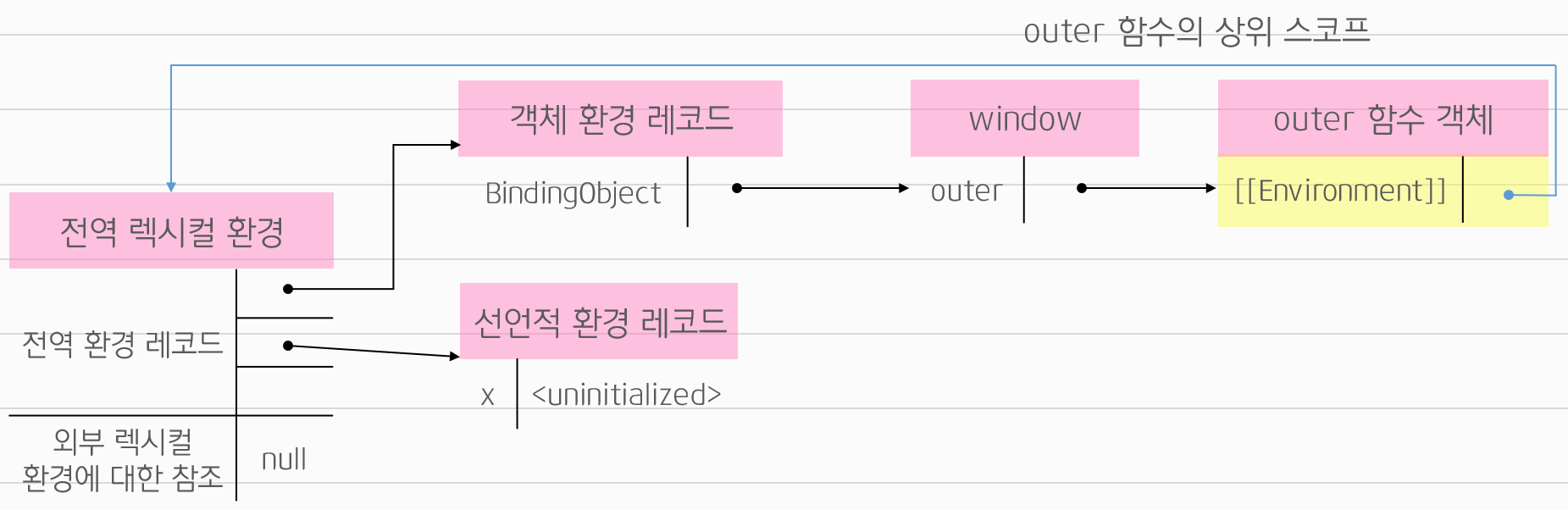 outer 함수를 호출하면 outer 함수의 렉시컬 환경이 생성되고, outer 함수 객체의 [[Environment]]에 저장된 전역 렉시컬 환경을 outer 함수 렉시컬 환경의 '외부 렉시컬 환경에 대한 참조'에 할당한다. 그리고 중첩 함수 inner가 평가되어 inner의 [[Environment]]에 outer 함수의 렉시컬 환경을 상위 스코프로서 저장한다.