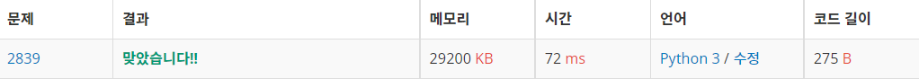 먼저 n이 5로 나눠진다면 바로 그 몫을 출력해주고(이 경우가 결과값이 가장 작은 경우이기 때문), 그게 아니라면 n에서 5*i만큼 뺀 후 3으로 나눠진다면 그 값을 tmp에 저장하도록 한다. tmp에 값을 저장할 때는 기존의 tmp값과 새로 나온 결과값을 비교해 작은값을 넣어준다. for문이 끝난 후에 tmp값이 바뀌어있다면(5와 3으로 나눠졌다면) tmp를 출력해주고, 나눠지지 않았다면 -1을 출력해준다.